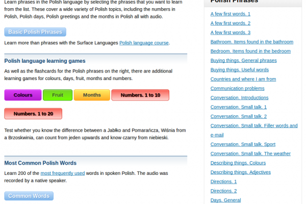 Surface Languages Polish offers free tutoring tools online for learning basic Polish phrases, ranging from your first words to small talk to general topics for getting by and more. Audio of native speakers is provided to ensure that your pronunciation is correct.