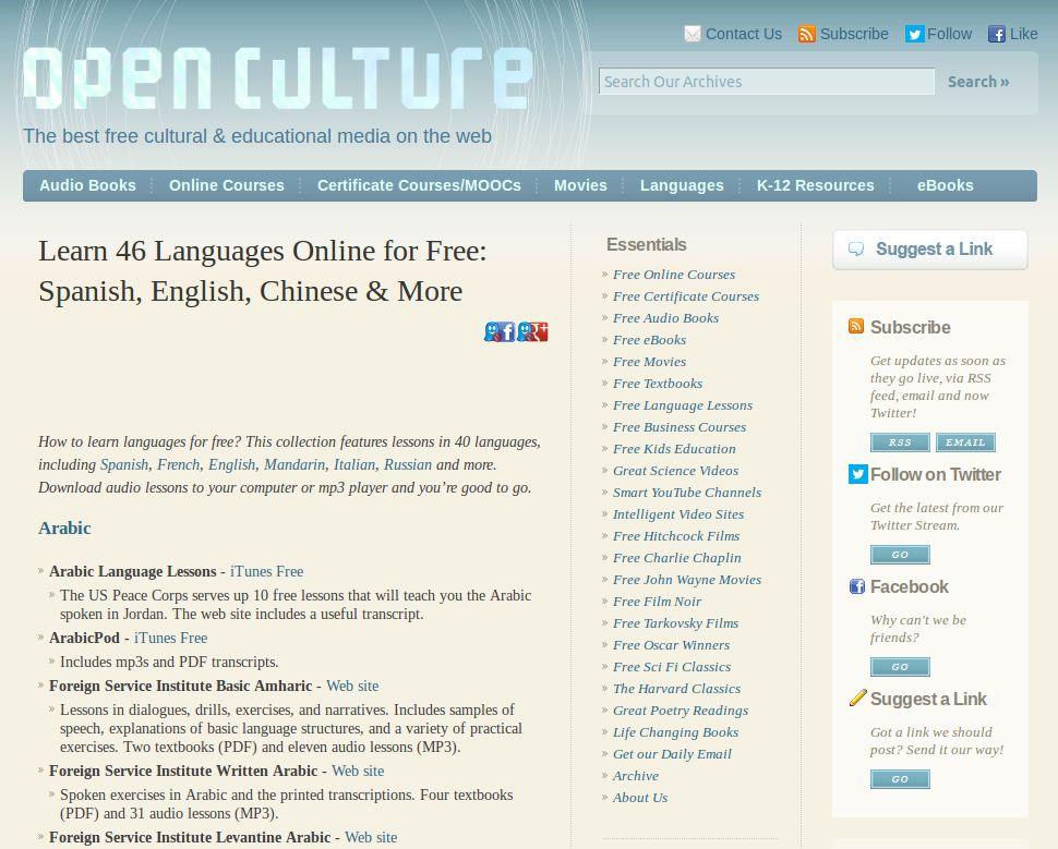 Links to Free Lessons for 45+ Languages on OpenCulture (Spanish, English, Chinese, German & more)